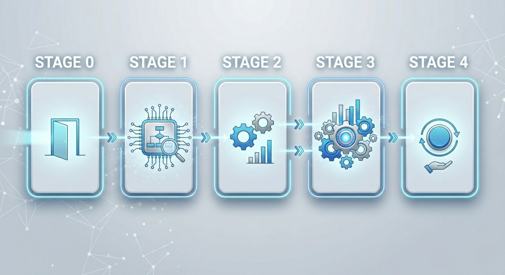 Stage-0 is the entry gate. Stages 1–3 are the core build. Stage 4 is optional execution support.